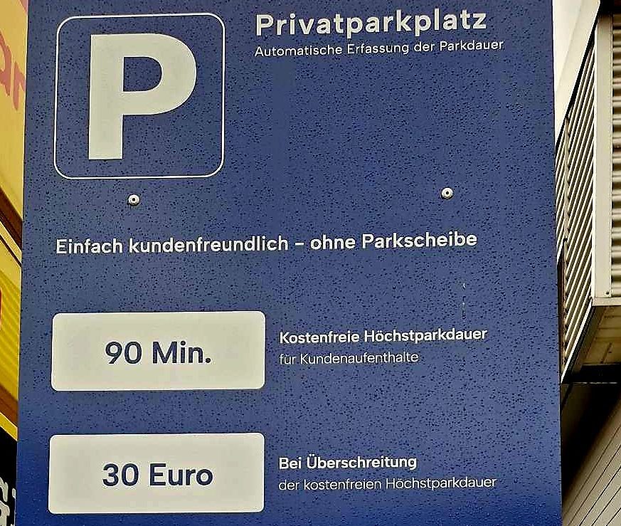 Bei Überschreitung der Höchstparkdauer von 90 Minuten „für Kundenaufenthalte“ wird eine „Vertragsstrafe“ von 30 Euro fällig, heißt es auf den großen blauen Informationstafeln.