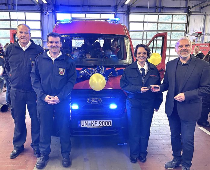 Mit einem besonderen Geschenk hat die Feuerwehr Unna den ersten Geburtstag ihrer Kinderfeuerwehr gefeiert: Bürgermeister Dirk Wigant, im Bild mit Wehrleiter Hendrik zur Weihen und Christian Luppa (Amtsleiter für Feuerschutz und Rettungswesen), übergab den Kindern ihr eigenes Einsatzfahrzeug im Logistikzentrum der Feuerwehr in Königsborn.