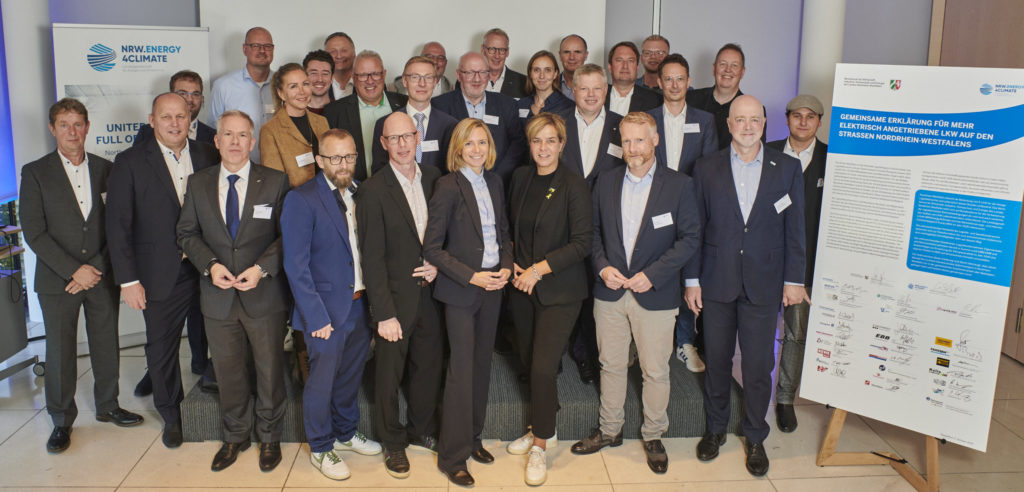 Beim Gipfeltreffen zur Kampagne „E-Trucks.NRW“ am 02.10.2025 in Düsseldorf unterzeichnen 21 Unternehmen eine Absichtserklärung, bis 2045 mehr als 1.600 emissionsfreie Fahrzeuge anzuschaffen.