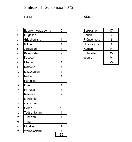 Im September waren 19 der Neueingebürgerten aus der Türkei und 18 aus Syrien. Der überwiegende Teil der Menschen mit jetzt deutschem Pass wohnt in Bergkamen (17), 15 leben in Schwerte.