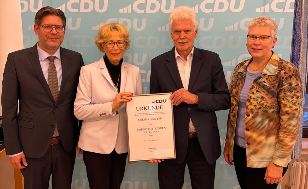 Ein besonderer Punkt auf der Tagesordnung war die Wahl von Gerhard Meyer zum Ehrenvorsitzenden der CDU Unna. Von ihm hatte Frau Wieczorek 2023 den Vorsitz übernommen, nachdem Herr Meyer diesen 14 Jahre lang innehatte.