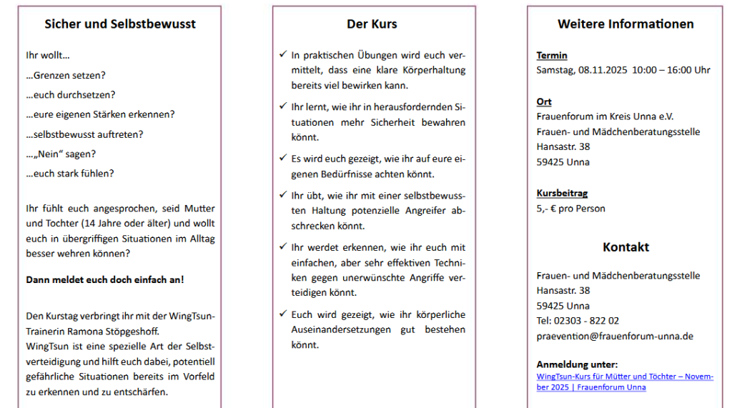 Die Frauen- und Mädchenberatungsstelle des Frauenforums im Kreis unna bietet am Samstag, 8. November, von 10:00-16:00 Uhr einen gemeinsamen Selbstbehauptungs-/Selbstverteidigungskurs für Mütter mit ihren Töchtern (ab 14 Jahren) an.