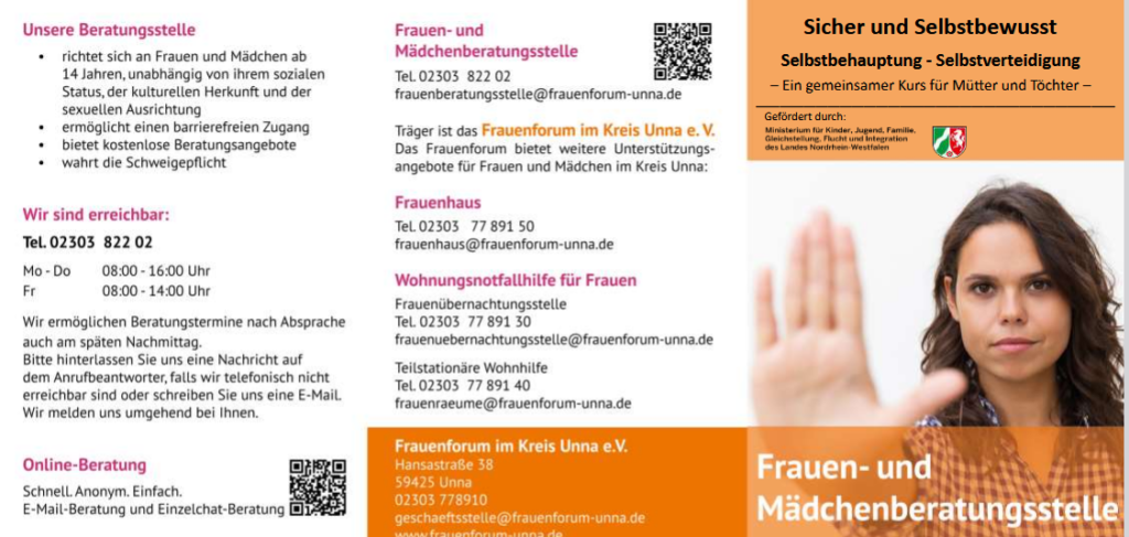 Dank einer Förderung des Ministeriums für Kinder, Jugend, Familie, Gleichstellung, Flucht und Integration NRW fällt lediglich ein geringer Kursbeitrag von 5,- € pro Person an. Weitere Informationen erhalten interessierte Frauen und Mädchen über die Frauen- und Mädchenberatungsstelle unter 02303-82202 sowie über praevention@frauenforum-unna.de. Anmeldungen werden über die Homepage www.Frauenforum-unna.de unter „Aktuelles“ entgegen genommen.