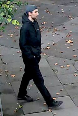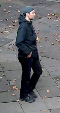 - 25 – 30 Jahre alt – Schmale Statur – Schmales Gesicht – Dunkler Ziegenbart – Kleine Augen – Helle Haut – Bekleidet mit schwarzer Jacke (Windbreaker / Softshelljacke) mit aufgezogener Kapuze (mit kleinem Schirm) und dunkler Hose.