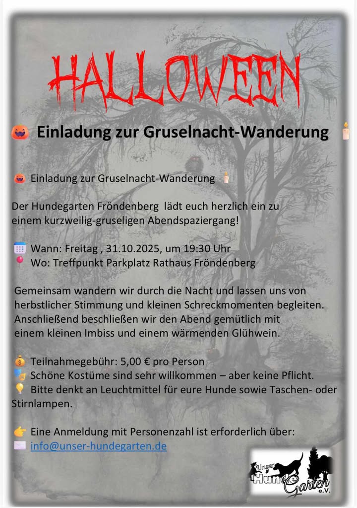 „Auch Hunde mit Maulkorb sind willkommen. Verkleiden darf sich jeder der mag, wichtig ist nur eine Beleuchtung für Hund und Mensch. Zum Abschluss lassen wir den Abend im Hundegarten in Fröndenberg ausklingen . Auch hier bleiben die Hunde an der Leine.“
