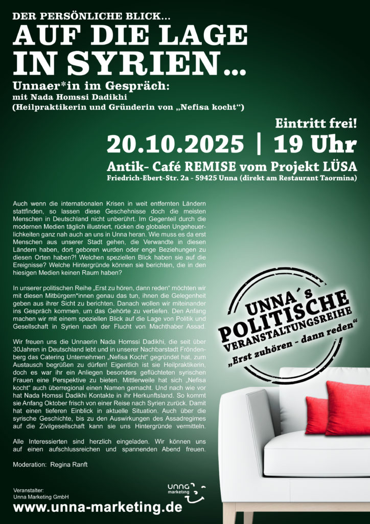 Der nächste Termin in der Reihe greift am heutigen Abend, dem 20.10.2025, ab 19 Uhr im Antikcafé Remise an der Friedrich Ebert Str. 2a in Königsborn ein außenpolitisches Thema auf.