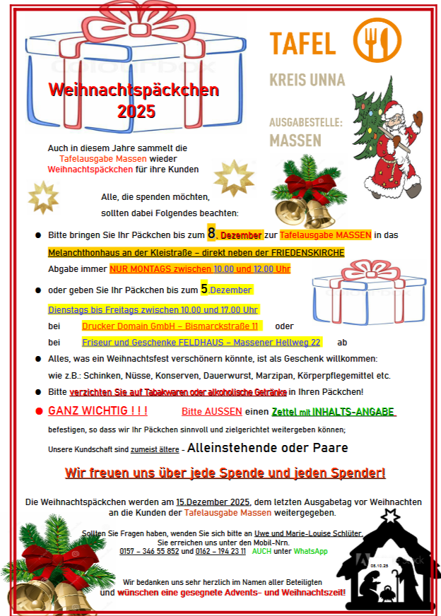 Mit dem Start der diesjährigen Aktion „Weihnachtspäckchen 2025“ bedanken sich die Mitarbeiter der Tafelausgabe Massen nochmals herzlich für die bisherige Unterstützung durch die Massener Bevölkerung, besonders bei den Annahmestellen der Weihnachtspäckchen: