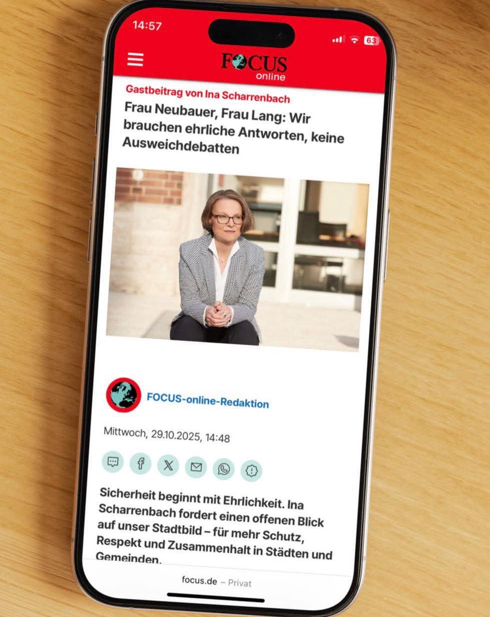 Zur aktuellen Stadtbild-Debatte, ausgelöst von Bundeskanzler Friedrich Merz (CDU), und dem offenen Brief von Ricarda Lang und Luisa Neubauer (beide Die Grünen) hat die aus Kamen stammende CDU-Landesheimatministerin Ina Scharrenbach in einem Gastbeitrag bei FOCUS online Stellung bezogen.