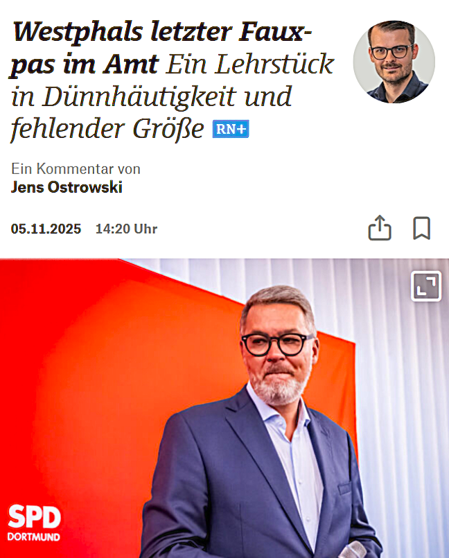 Unter dem Titel „Westphals letzter Fauxpas im Amt – ein Lehrstück an Dünnhäutigkeit und fehlender Größe“ erschien in den Ruhr Nachrichten (Plus-Artikel, Onlineausgabge) am 5. November ein Meinungsbeitrag, in dem die Art des Abschieds des Ex-Stadtoberhauptes scharf kritisiert wird. Denn der Sozialdemokrat ließ sich selbst eine Abschiedsfeier für 25.000 Euro Steuergeld ausrichten.