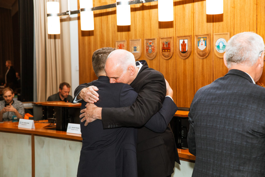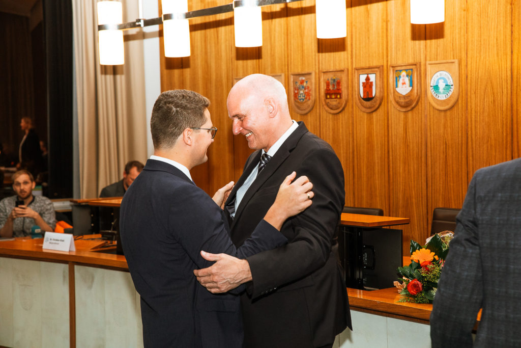 045: SPD-Fraktionsvorsitzender Rüdiger Billeb gratuliert Thorsten Redeker (CDU) zur Wahl als 1. stellvertretender Bürgermeister.