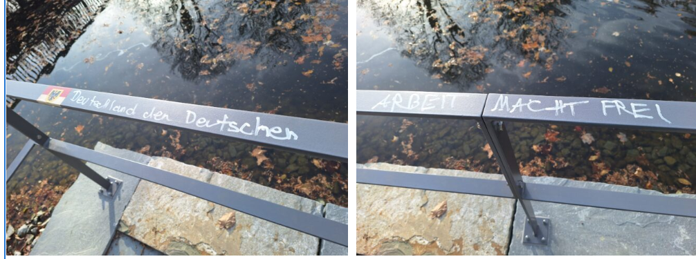 Vor Ort hatten die Beamten nach dem Hinweis der Zeugin festgestellt, dass im oberen Bereich des Metallzauns mit weißer Farbe die nationalsozialistischen und volksverhetzenden Parolen „Deutschland den Deutschen“ sowie „Arbeit macht frei“ aufgebracht wurden.