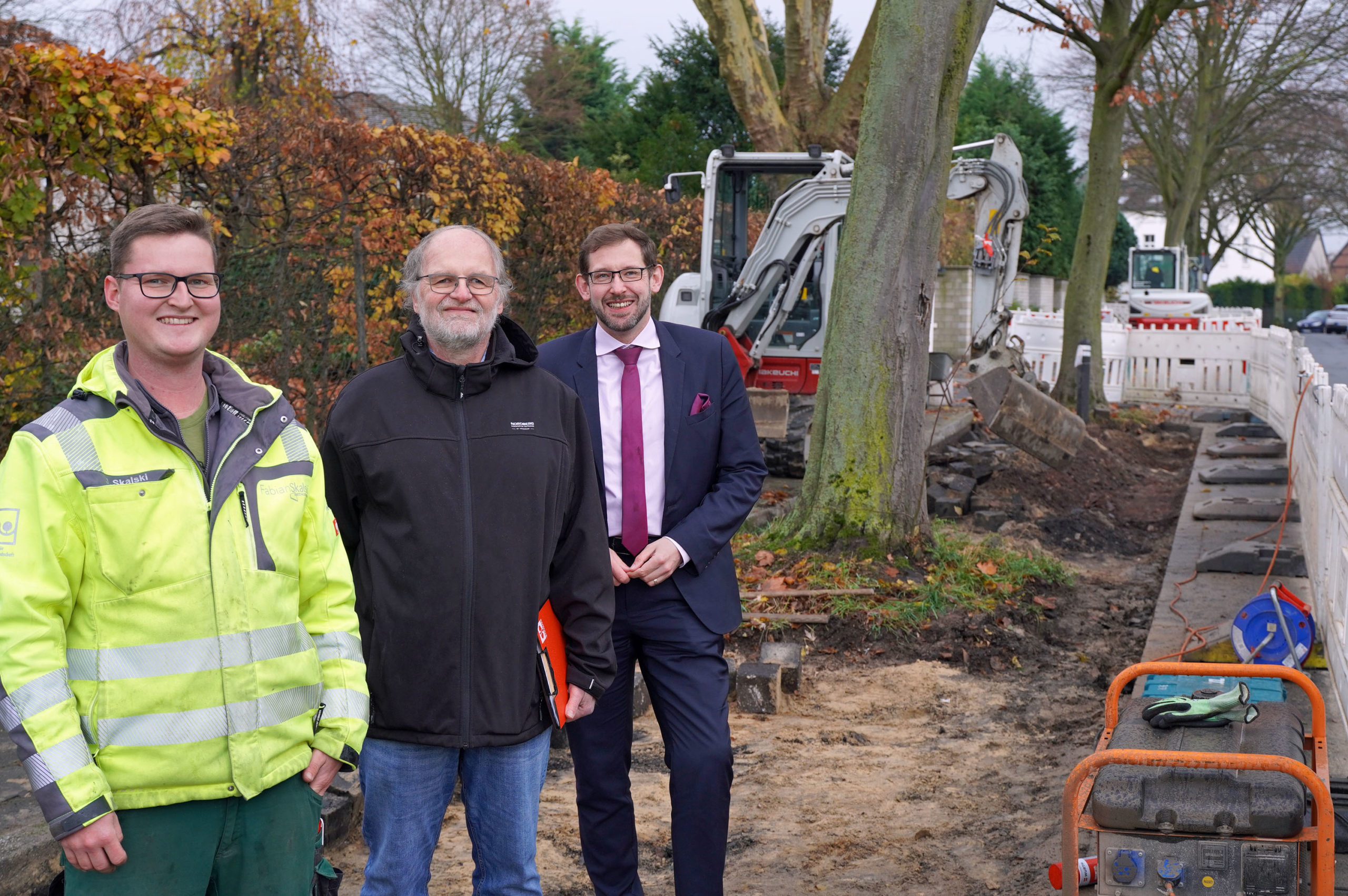 Aus einem Parkstreifen wird ein Grünstreifen: Erster Beigeordneter Sandro Wiggerich (v.r.), Andreas Siebeck (Umweltamt) und Fabian Skalski (Fa. Skalski Gartengestaltung) freuen sich über den Beginn der Umgestaltung an der Gerichtsstraße. (Foto Stadt Unna)