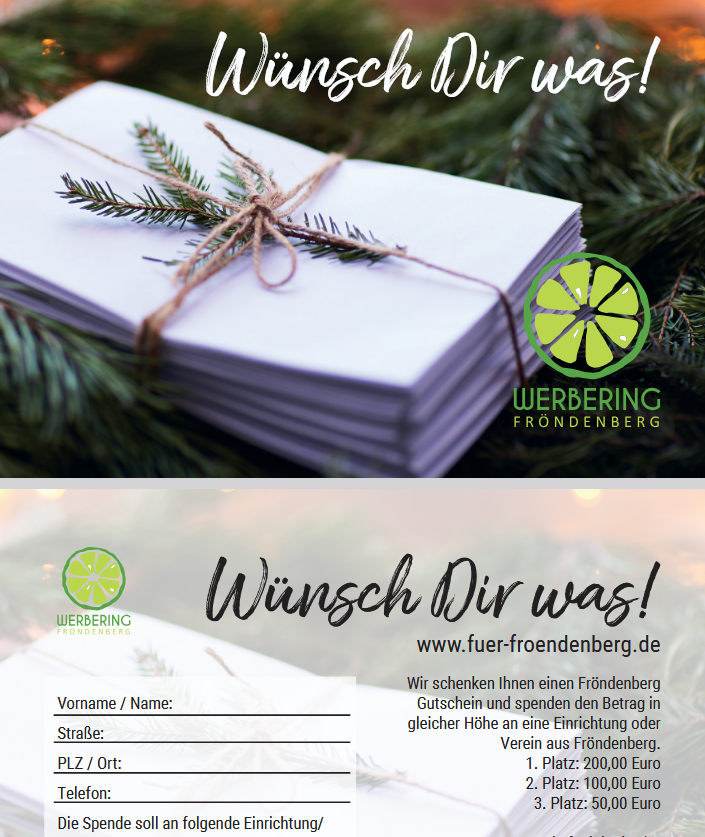 Parallel dazu läuft die Aktion „Wünsch Dir was!“, bei der Bürgerinnen und Bürger einen Fröndenberg-Gutschein gewinnen können – und gleichzeitig etwas Gutes für die Stadt tun.