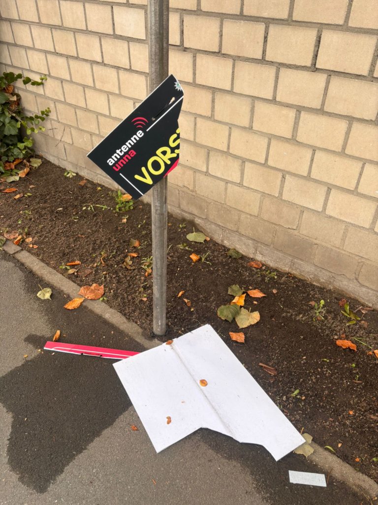 Es wurden Pfandkästen zerstört, Zwerge beschädigt, Schilder zerschlagen, ein Flaggenmast umgebrochen und die Flagge gestohlen. Ein rausgerissener Fahrradständer stand plötzlich auf dem Radweg. Und überall die Aufkleber.