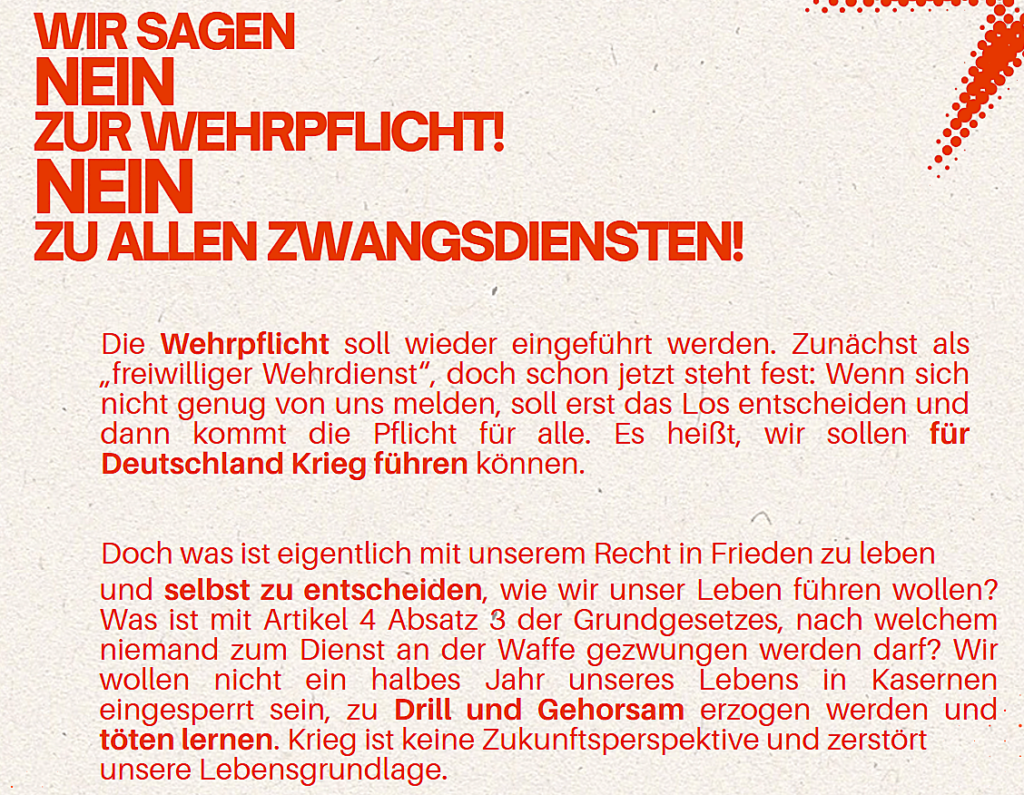 Nach dem aktuellen Gesetzentwurf sollen ab Januar 2026 alle 18-Jährigen einen Fragebogen zur sogenannten „Wehrdiensttauglichkeit“ ausfüllen. Junge Männer ab dem Jahrgang 2008 sollen verpflichtend zur Musterung. Die Schüler fordern: Statt Milliarden in Waffen zu stecken, sollten diese Milliarden in Bildung, bessere Ausbildungsplätze, das Klima und ihre Zukunft investiert werden.