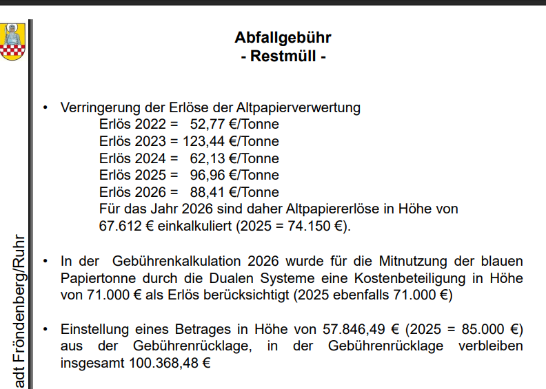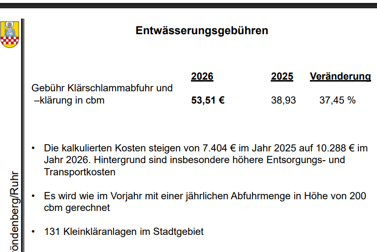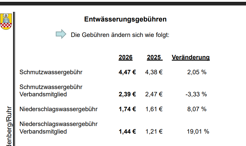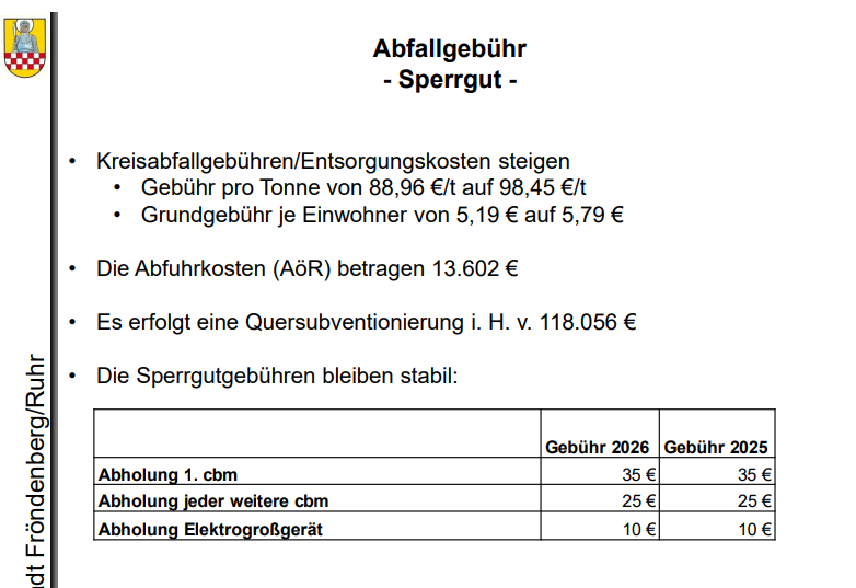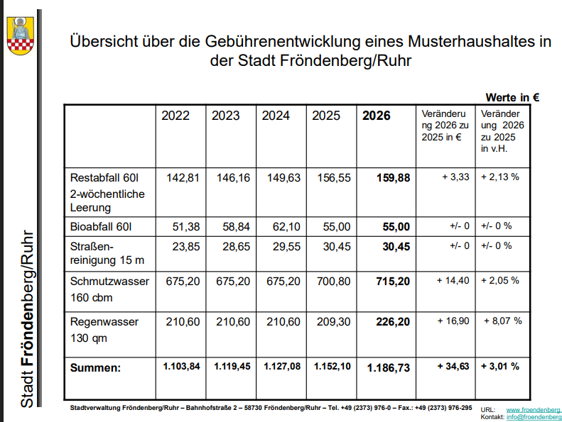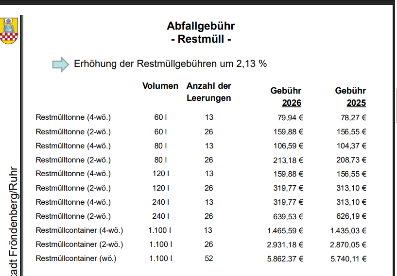 Gebühren in Fröndenberg steigen erneut – Musterhaushalt zahlt 2026 über 30 Euro mehr