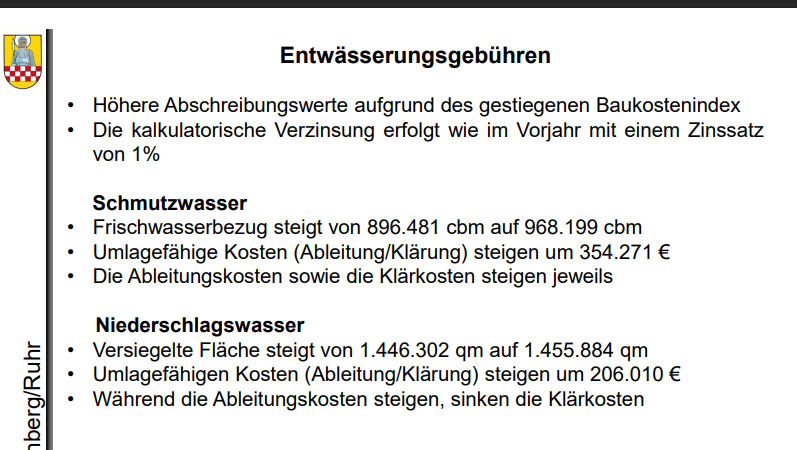 Die Bürger der Stadt Fröndenberg müssen im kommenden Jahr erneut höhere Gebühren zahlen. Die gesamte Mehrbelastung alle Gebühren zusammengerechnet – von Müll bis Abwasser – summiert sich für einen Musterhaushalt auf rund 34 Euro zusätzlich im Jahr.