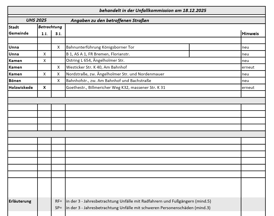 Die in den vergangenen Tagen neu behandelten Unfallhäufungsstellen aus dem Jahr 2025 sind der unten eingefügten Tabelle zu entnehmen.