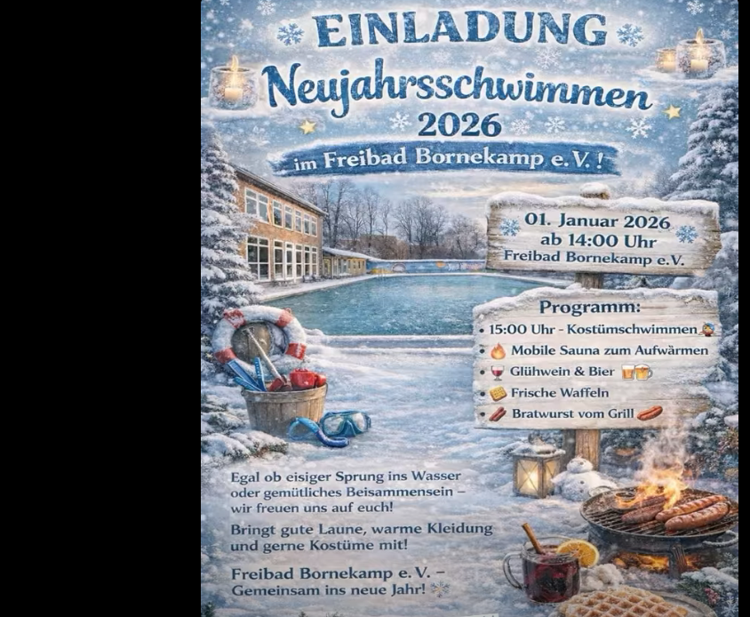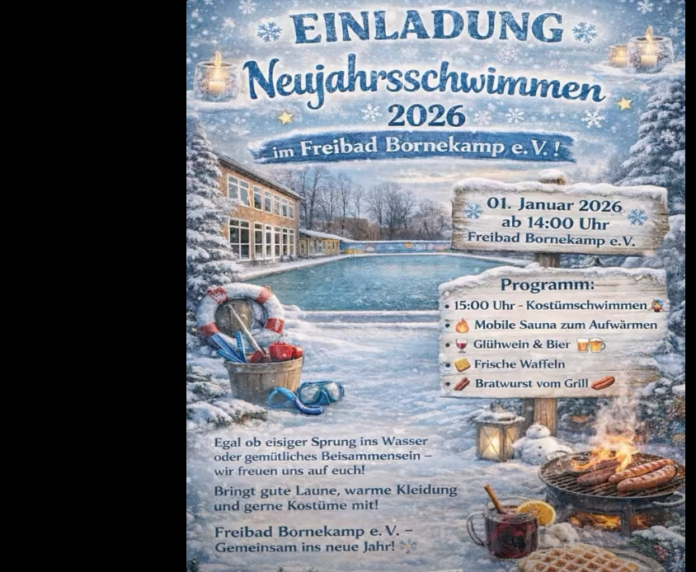 Das Freibad Bornekamp Unna lädt am Neujahrstag zum traditionellen Neujahrsschwimmen ein. Ab 14 Uhr ist das Freibad für Besucher geöffnet.