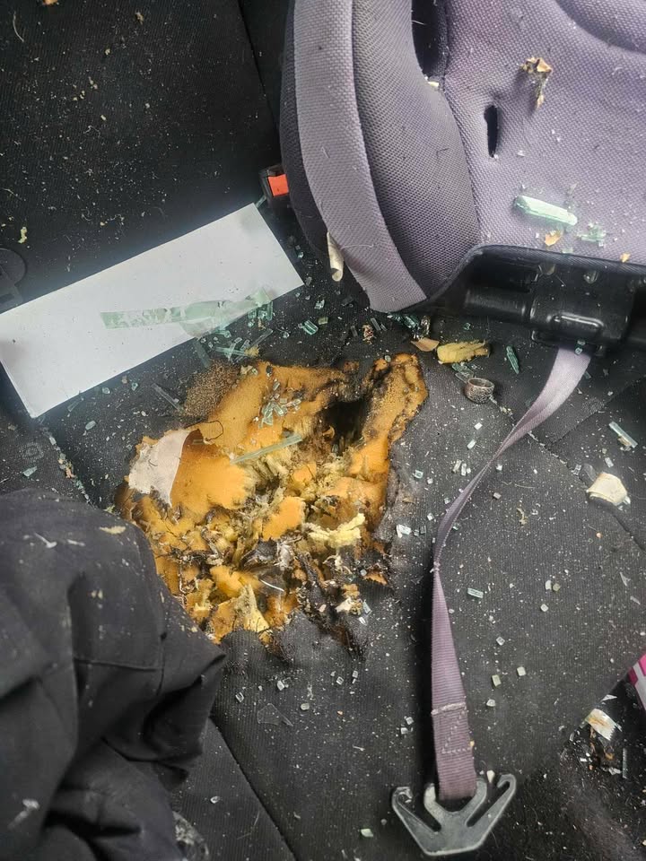„Die Windschutzscheibe ist durch die Druckwelle massiv gerissen. Zudem ist eine Jacke, die auf dem Sitz lag, durch die Hitzeentwicklung mit dem Polster verschmolzen.“