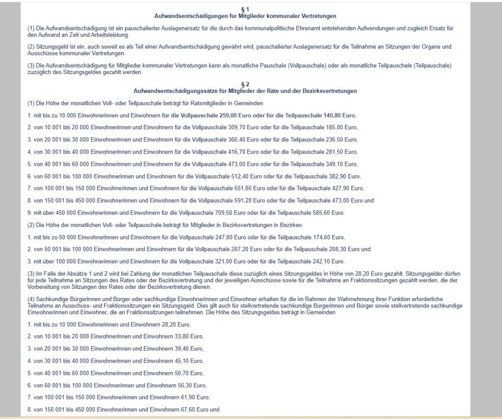 Die Pauschalen für die ehrenamtlich tätigen Ratsmitglieder Tätigen legt die „Entschädigungsverordnung Nordrhein-Westfalen“ fest. Die Höhe ist nach Einwohnerzahl gestaffelt. Hier ein paar Beispiele: