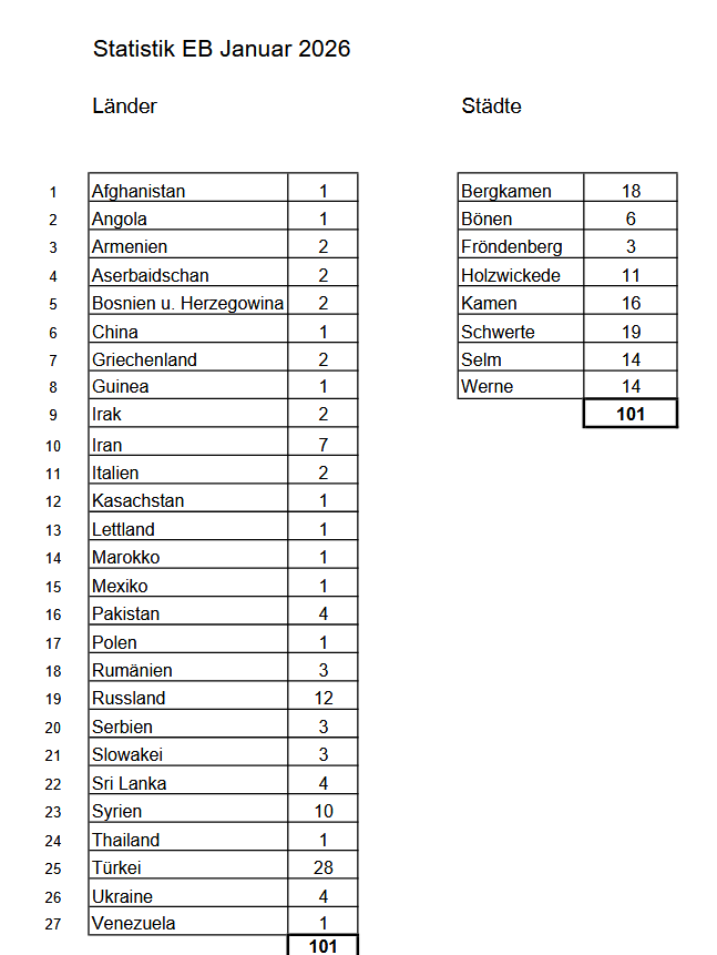 19 der 101 Neubürger wohnen in Schwerte, 18 in Bergkamen und 16 in Kamen. Die anderen Herkunftsländer sowie die Verteilung der Neubürgerinnen und Neubürger auf die einzelnen Städte und Gemeinden:
