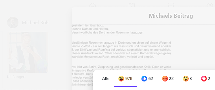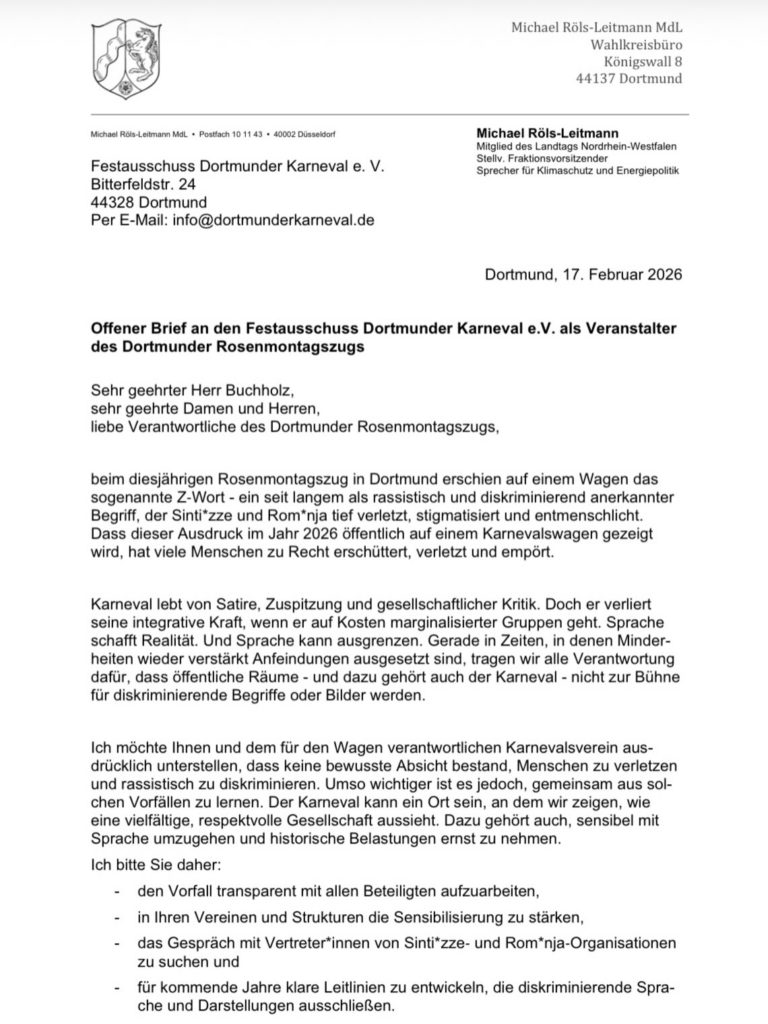 Mit einem empörten öffentlichen Posting meldet sich der Dortmunder Grünen-Sprecher und Landtagsabgeordnete Michael Röls-Leitmann im Anschluss an den Rosenmontagszug in Dortmund zu Wort.