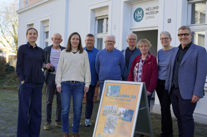 Die Kuratorinnen Kathrin Göttker (l.) und Dr. Tina Ebbing (3.v.l.), Amtsleiter David Nethen (r.), Museumsleiterin Dr. Beate Olmer (2.v.r.) und die Mitglieder des Foto-Clubs Unna freuen sich auf die Eröffnung der Sonderausstellung „Unna 2D – Ansichten einer Stadt“ im Hellweg-Museum Unna. (Foto Stadt Unna)