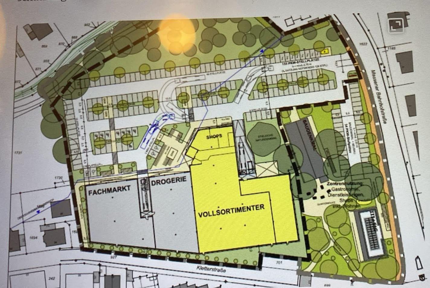 …mit Edeka (ca. 1.500 m² VKF), einem Drogeriemarkt (max. 750 m² VKF), einem Nonfood-Fachmarkt (max. 800 m² VKF) sowie ein Wohngebäude mit ca. 11 Wohnungen. Die Märkte werden von der Massener Bahnhofstraße mit einem Parkplatz mit ca. 155 Stellplätzen erschlossen.