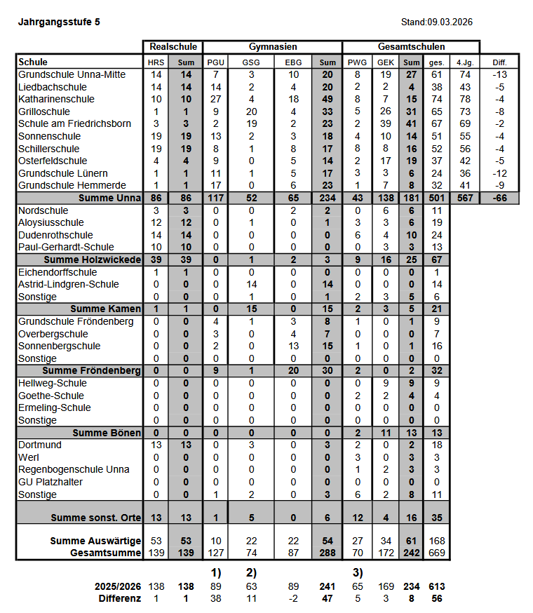 Bis Donnerstag, 19.03.2026, läuft noch die Anmeldung an den drei Unnaer Gymnasien, den beiden Gesamtschulen und der Realschule. Die Zwischenergebnisse aus der terminierten Anmeldewoche liegen jetzt jedoch vor.