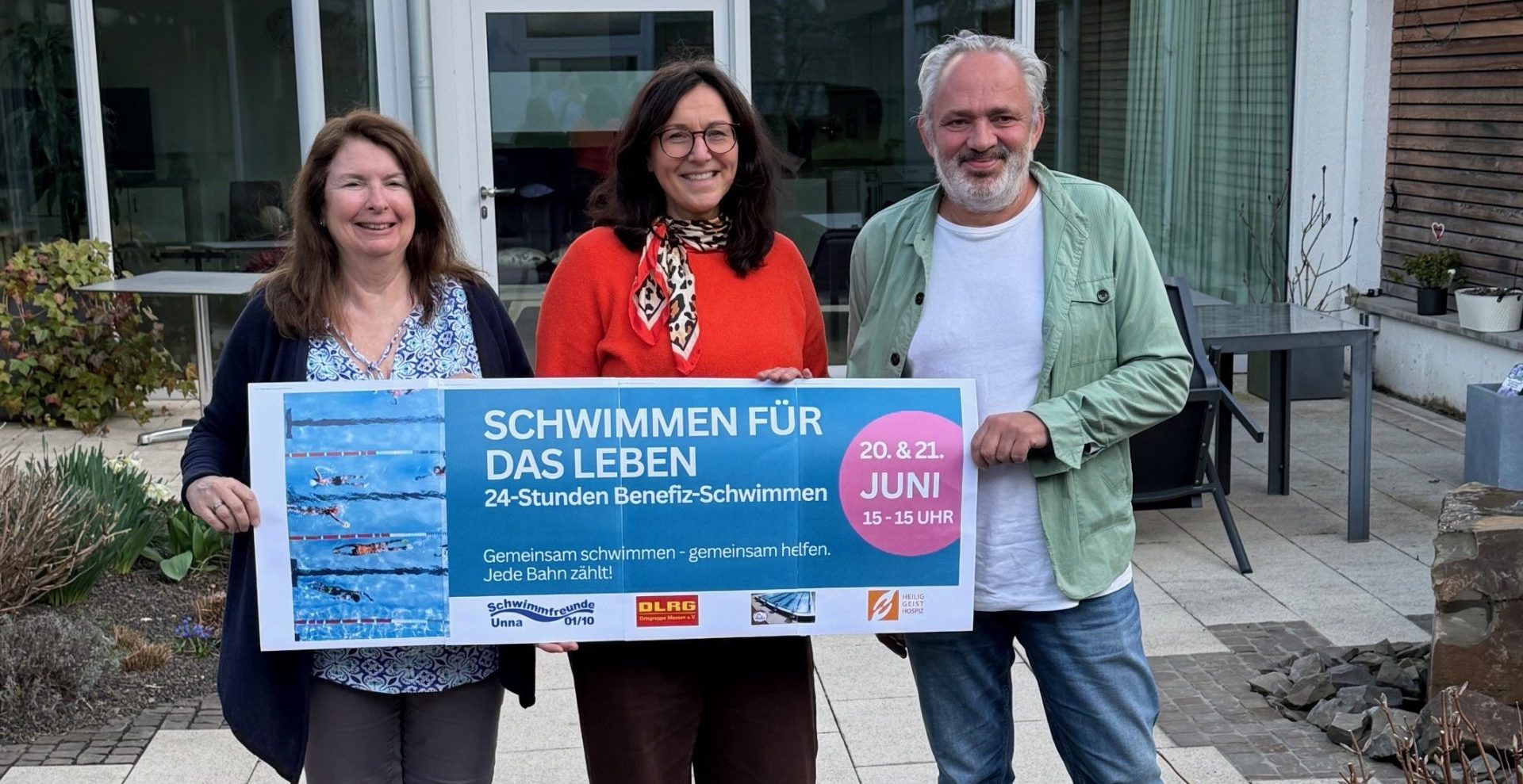 Foto v.l.:  Jessica Mense, 1. Vorsitzende Freibad Bornekamp e.V., Betty Klee, Fundraising Heilig-Geist-Hospiz, Dirk Winkelkötter, 2. Vorsitzender Schwimmfreunde Unna 01/10 e.V, es fehlt: Christian Bressler, Pressewart DLRG Ortsgruppe Massen. Foto; Kath. Hospitalverbund Hellweg