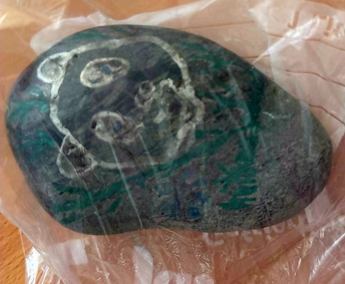 Es handelt sich um eine bemalten Stein, mit dem unbekannte Täter am Sonntag (15.03.2026) zwischen 15:25 und 20:25 Uhr an einem Haus am Efeuweg eine Fensterscheibe einwarfen.