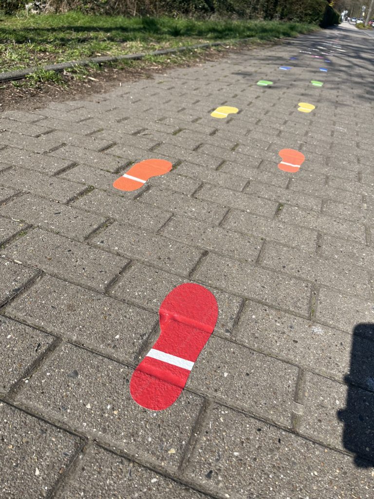 Bunte Fußabdrücke, von Kindern angeregt, für weniger Elterntaxis vor Bergkamener Grundschule