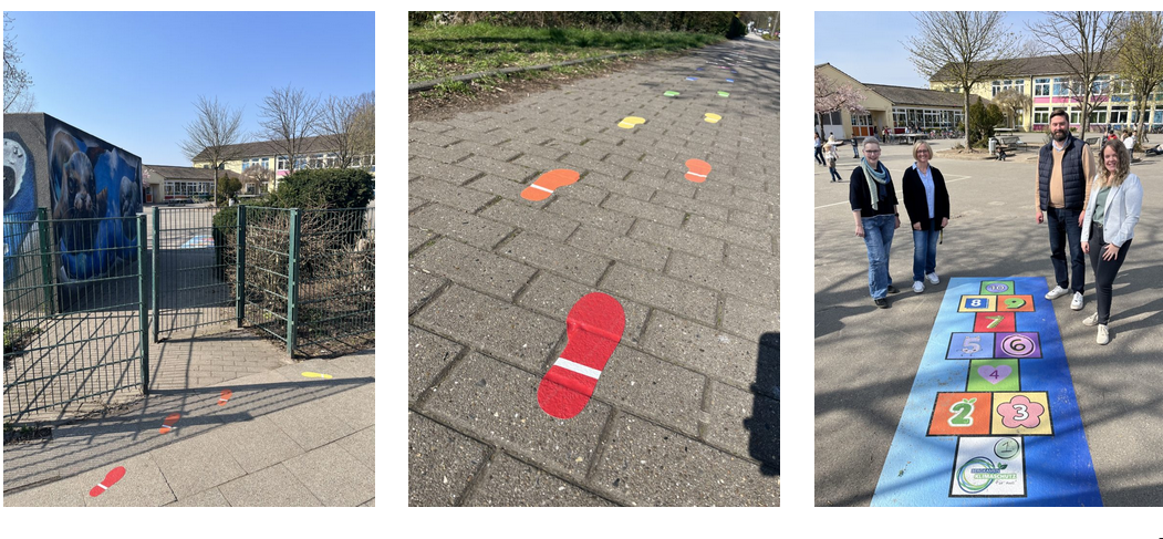 Bunte Fußabdrücke auf dem Gehweg und ein Hüpfspiel auf dem Schulhof vor der Pfalzschule Bergkamen sollen Kinder künftig dazu motivieren, das letzte Stück ihres Schulwegs zu Fuß zurückzulegen.