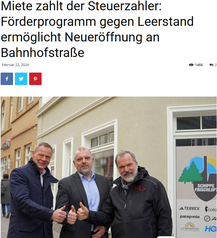 Im Januar 2024 verkündeten Bürgermeister Dirk Wigant, Marketingchef Horst Bresan (re.) und Wirtschaftsförderer Martin Bick in Wort und Bild den Einstieg in eine neues Förderprogramm, das steuerfinanziert leere Läden füllen soll. Das Aus für die Schippe Frischluft kam sang-, klanglos und ohne begleitendes Pressefoto. Screenshot unseres damaligen Berichts.