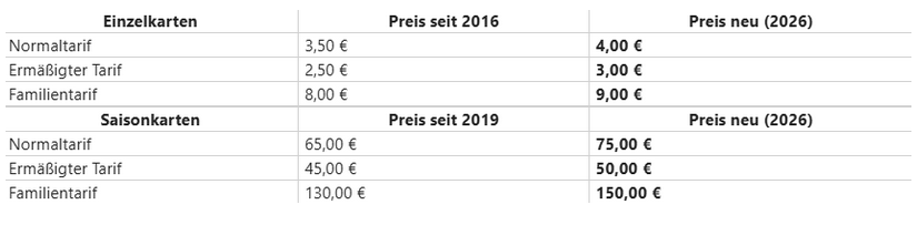 „Nach einer langen Phase der Preisstabilität erfolgt zur Saison 2026 eine Tarifanpassung“, teilt der Betreiber in einer Mitteilung vom 8. April mit. „Die Stadtwerke reagieren damit auf die allgemeinen Kostenentwicklungen im Bäderbetrieb.