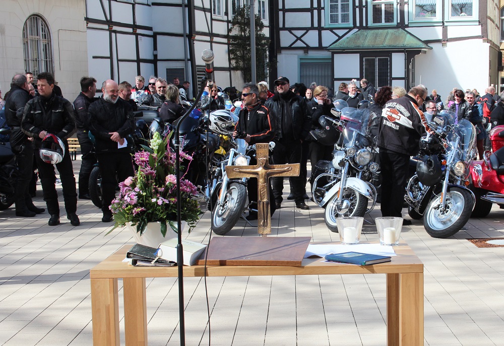 „Speisen und Getränke geben im Anschluss an den Gottesdienst die Möglichkeit zum Kennenlernen und zu reichlich Benzingesprächen. Hierzu sind alle Biker und Bikerinnen mit ihren Motorrädern herzlich eingeladen. Sollte das Wetter wieder aller Erwartung regnerisch sein, werden wir den Gottesdienst in die Kirche verlegen.“