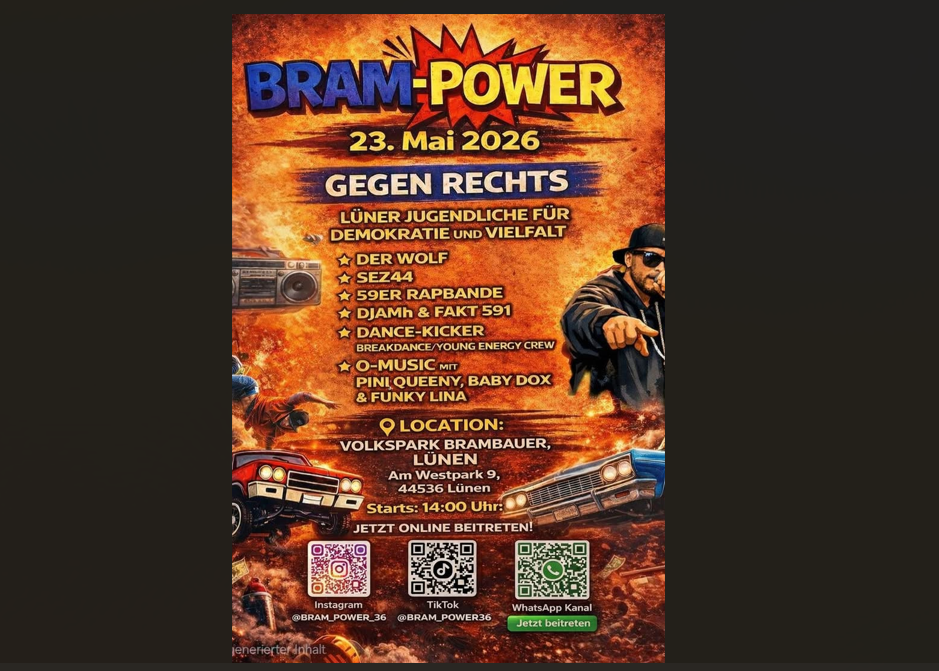 „Am 23. Mai 2026 setzen wir gemeinsam ein Zeichen!“, heißt es aus Lünen. Das Zeichen soll „gegen Rechts“ gesetzt werden, bei einem Festival namens „BRAM:POWER – Gegen Rechts“ am Samstag vor Pfingsten im Volkspark Lünen-Brambauer.