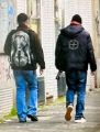 Der Schläger ist ebenfalls ca. 40 Jahre alt – Schwarze Kappe oder Mütze – Dunkelblaue Jacke mit rundem Aufnäher/Logo auf dem Rücken (möglicherweise der Marke „Stone Island“) – Dunkle Jeanshose – weiße Sneaker.