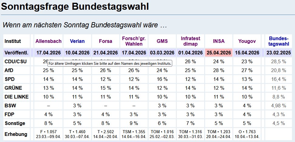 Das Meinungsforschungsinstitut Insa veröffentlichte dieses Ergebnis am Samstag, 25. April. Die anderen Parteien blieben gegenüber der Befragung zuvor am 21. 4. unverändert, so dass die Union bei Insa nun erstmals 4 Punkte hinter der AfD auf dem zweiten Platz liegt.