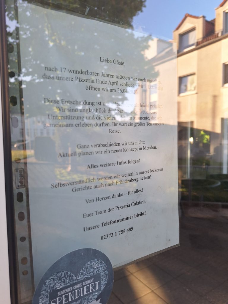 Am 26. April war der letzte Öffnungstag der Pizzeria Calabria. Noch vor dem Monatsende ist das Restaurant mit einladender Außenterrasse direkt am Eingang zum Himmelmannpark geschlossen und wird auch nicht wieder eröffnen, zumindest nicht in Fröndenberg.