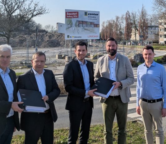 Fußläufig zum Rathaus ein neuer Edeka, eine Drogerie, Gastronomie und Seniorenwohnungen.